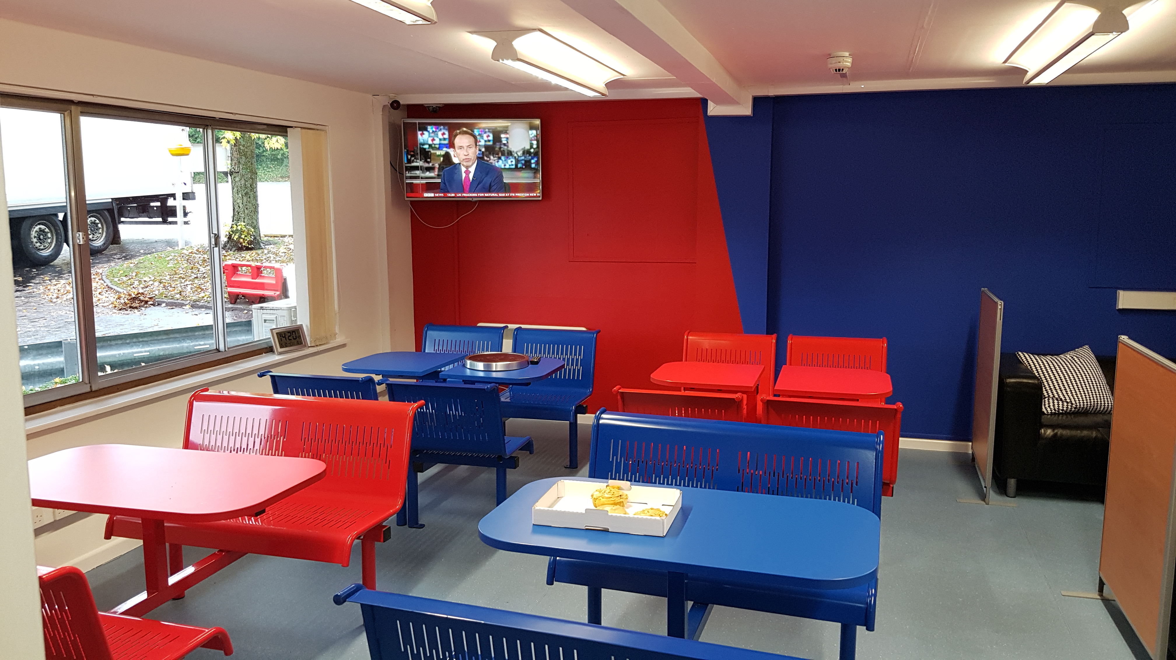 This was a staff canteen where the customer wanted the room brightened up by colour matching one wall to the furniture, in this case the customer managed to find paint very close to the furniture colour but it would probably have been possible to get the RAL colour reference from the furniture manufacturer. Colours used were 3 white walls with Johnstone’s Signal Red and Navy Royal as a feature wall.