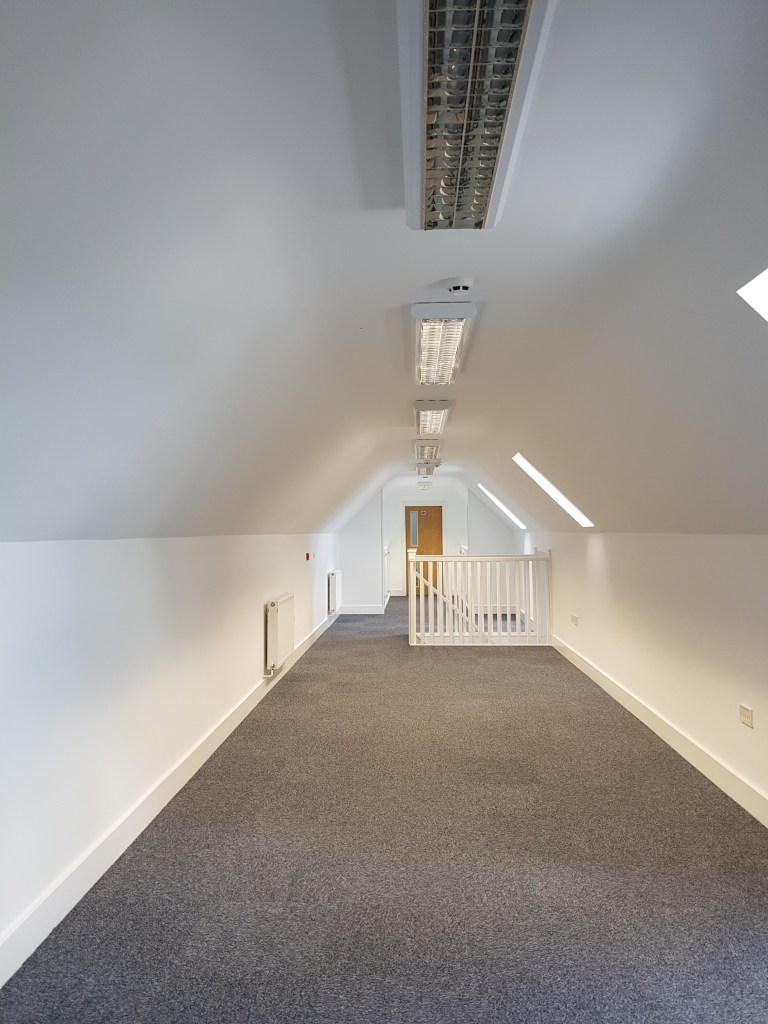 This was a reasonable sized office building that was predominately empty apart from a few items left from previous tenants. The walls had a large number of holes where shelving had been removed and the main reception had one double height wall painted in red. The landlord wanted the entire building returned to a neutral colour and so we painted the entire building in white, using Albany vinyl matt for the walls and ceilings with the woodwork in Johnstones oil based eggshell