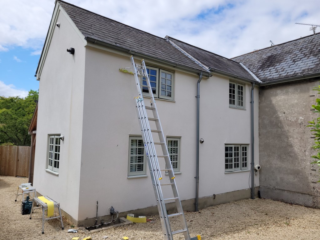 Below is an old farm house in West Ashton, just outside Trowbridge, to do the paintwork above the conservatory we had to have scaffolding, the rough render had two coats of Dulux Weathershield Gardenia smooth with the black woodwork having an undercoat and top coat of Dulux Weathershield Satin