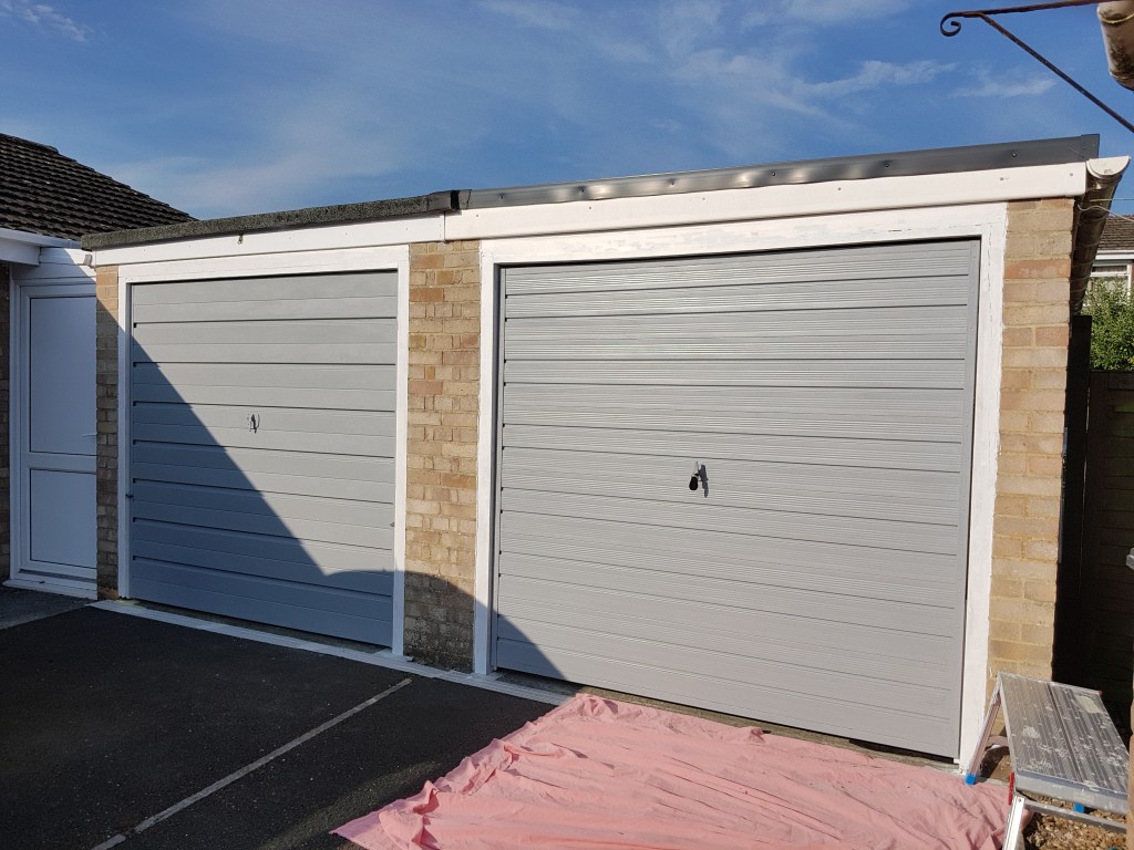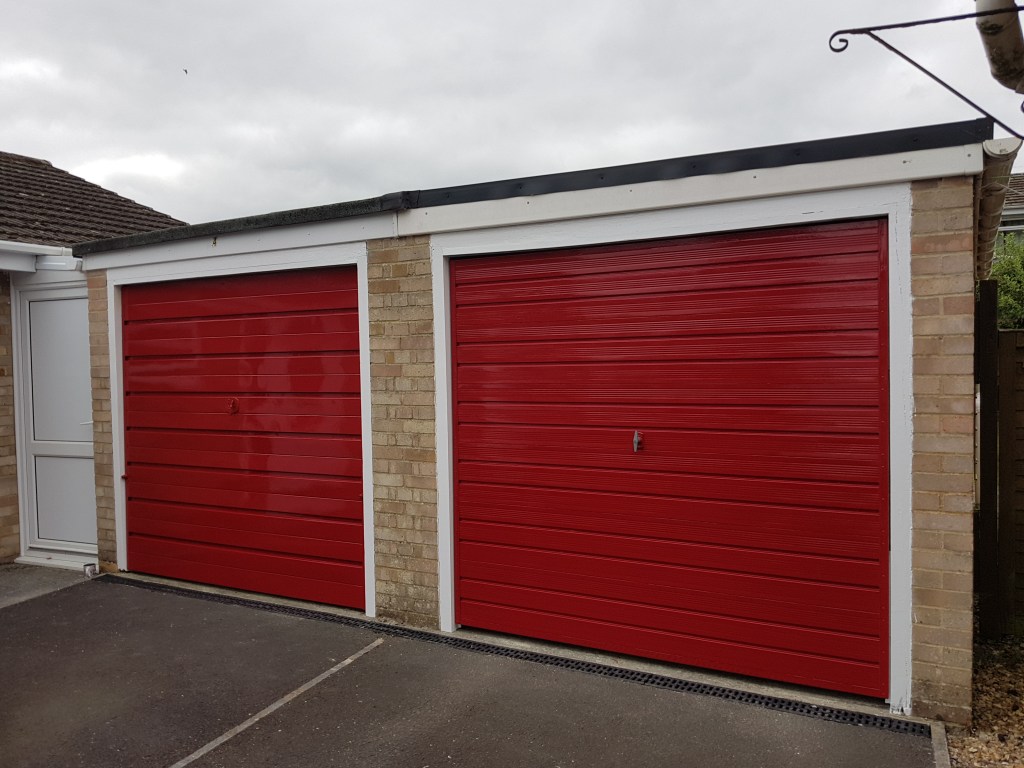 Doors before work started, although not obvious from the picture the right one is peeling badlyDoors in Grey metal primerGarage Doors finished in Dulux Ruby Starlet, in Warminster