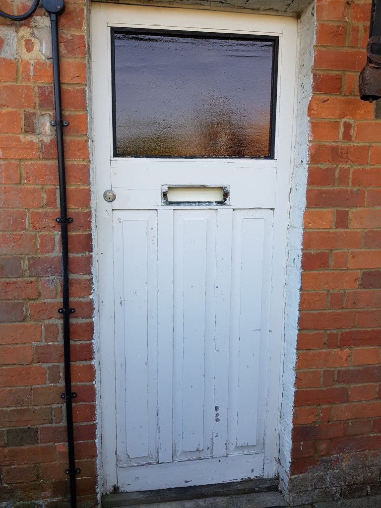 Rear of property before paintingRear of property after painting, walls painted with Dulux white masonry paint, woodwork with white and black Dulux high gloss and veranda supports re stained with Sadolin, we also replaced the wooden lintel above the old privy doorSide window undergoing preparationSide window repainted in Dulux High Gloss and the window reveals in Dulux masonry paintFront door prior to preparation and paintingFront door repainted, in Dulux high gloss white and black, with reveal in Dulux white masonry paint, the customer had ordered a new letter box we believe
