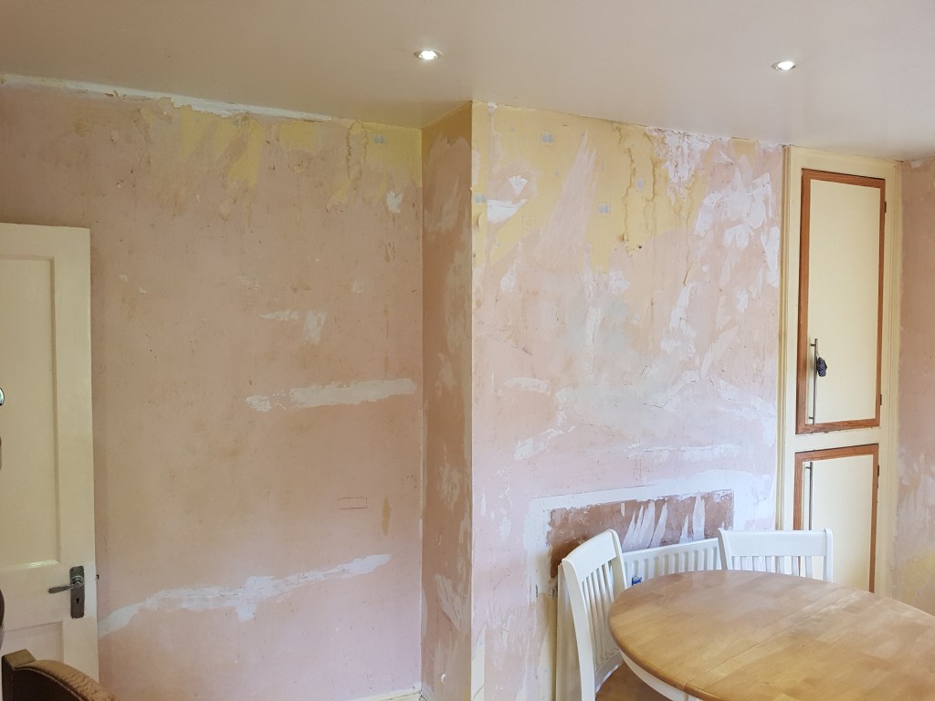The customer wanted their kitchen wallpapered, and the ceiling and woodwork painted. The customer had attempted to remove the wallpaper themselves and given up