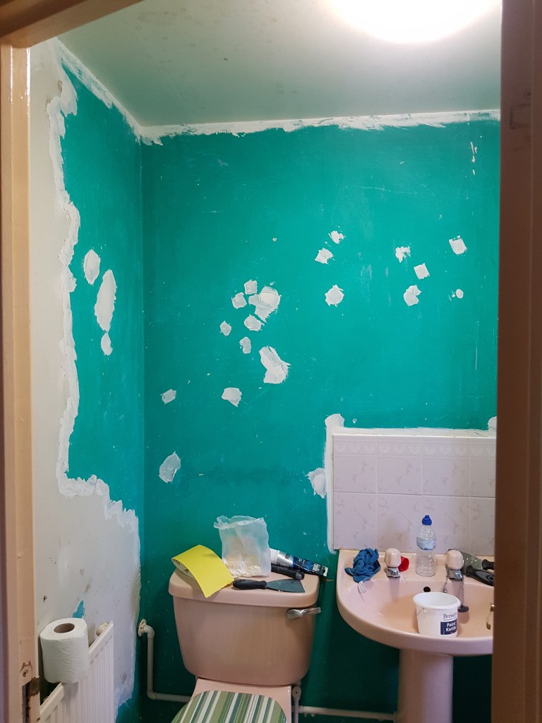 Bathroom after the customer had tried to remove the wallpaper themselvesWallpaper removed, and small holes filled, with featheredge filling of the joint between painted wall and bare plasterboardFinal finish after 4 coats of Albany white vinyl matt to the walls and ceiling and 3 coats Johnstone water based eggshell to the door and woodwork