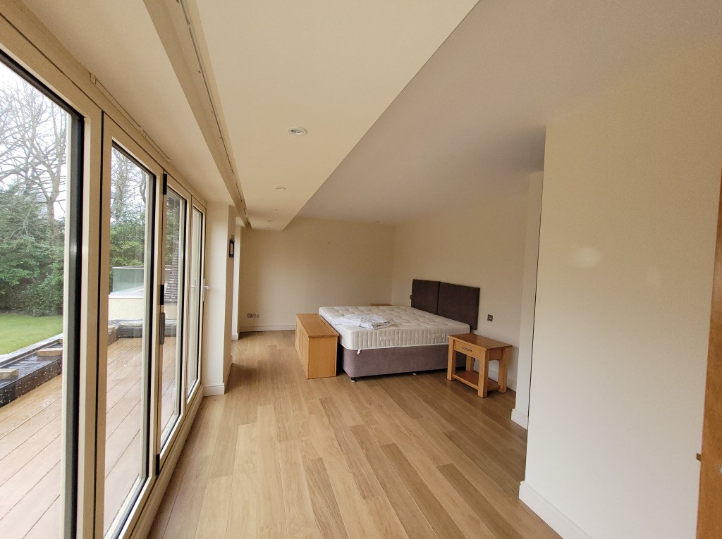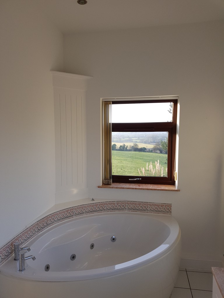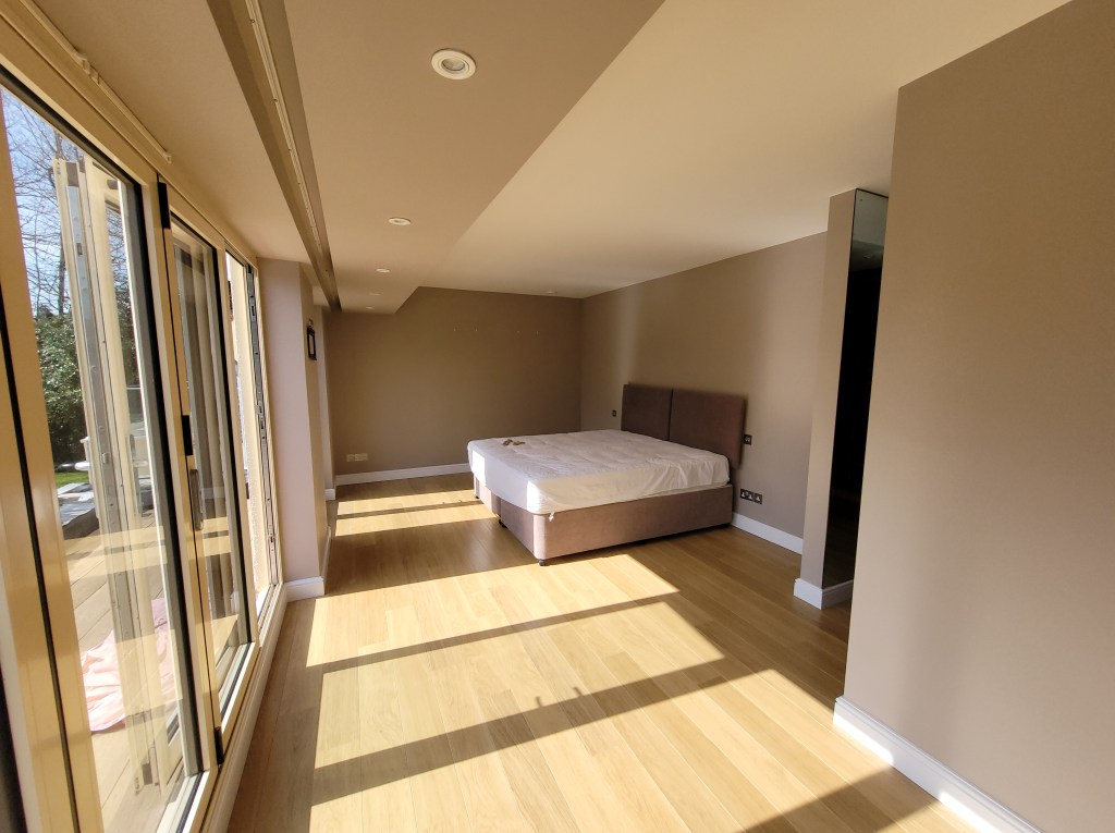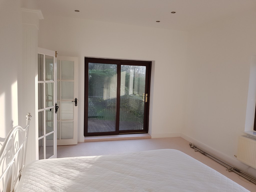 Bedroom before painting, with a large feature wall to the left originally in green, the customer kindly cleared the room apart from the bed which we sealed with plastic sheeting prior to startingRoom after painting now in white, using Albany white vinyl matt for the walls and ceiling and Johnstone’s oil based white eggshell for the woodwork, the customer didn’t want the curtain rails refittingEnsuite freshened up in white with stunning views from the ensuite and the main bedroom
