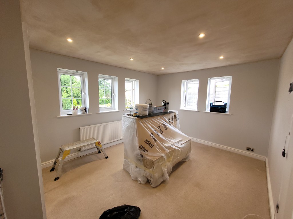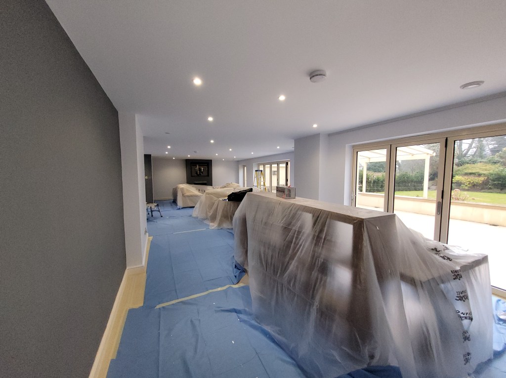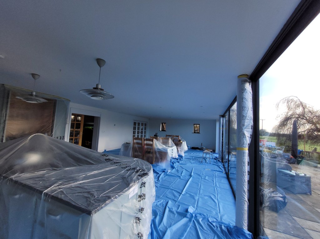 Large Kitchen/Family room during painting, all the kitchen units are covered in statically charged film and the flooring with waterproof barrier sheets. The room will be finished in Tikkurila AR2 on the ceiling with Dulux Soft Sheen in Brilliant white on the walls and the woodwork in Dulux white satinwood